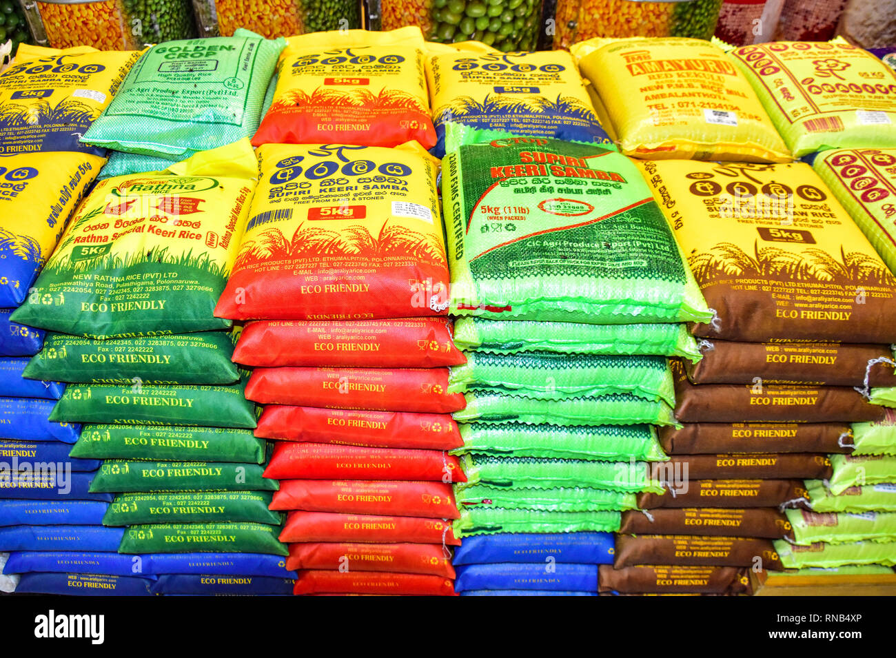 Essential food supplies including rice, lentils, canned goods, and nutritional supplements for families.